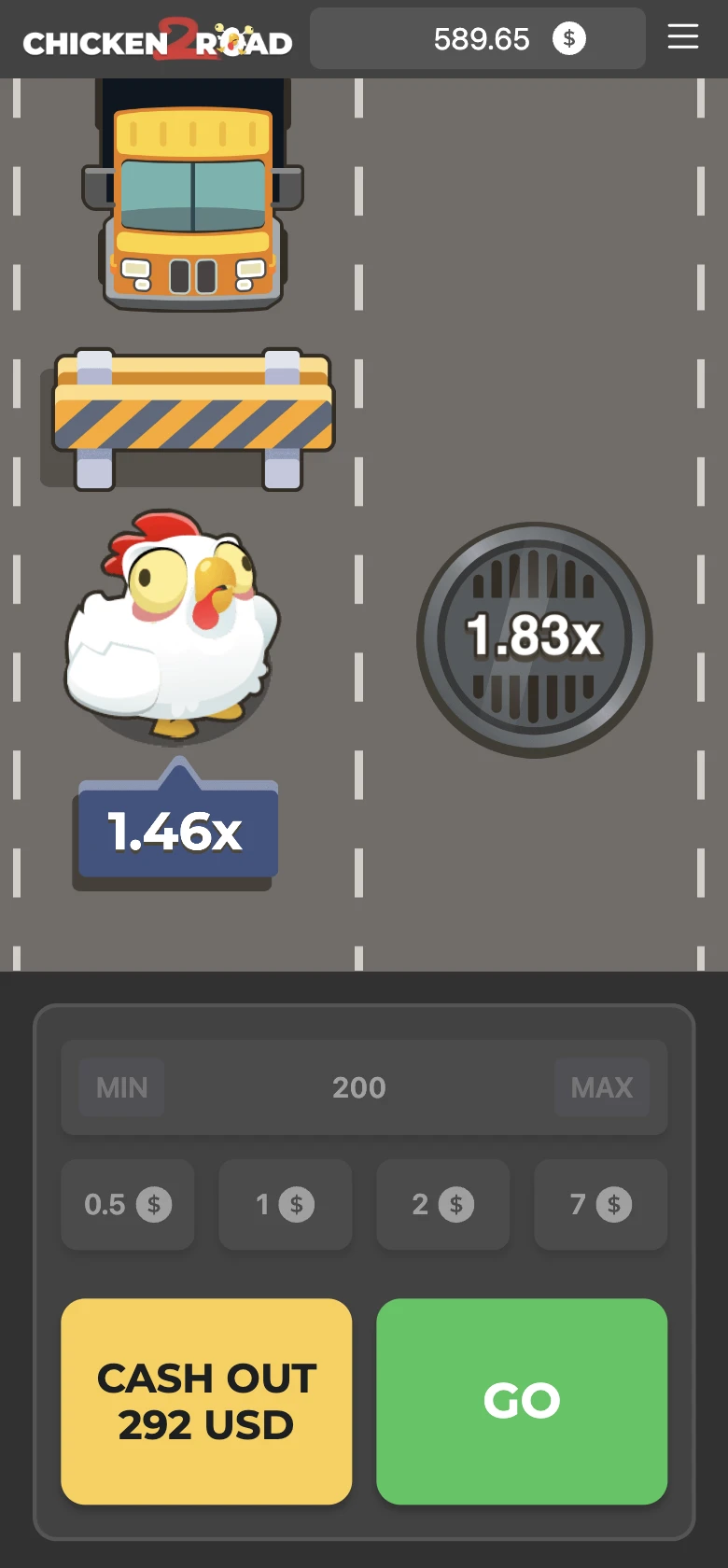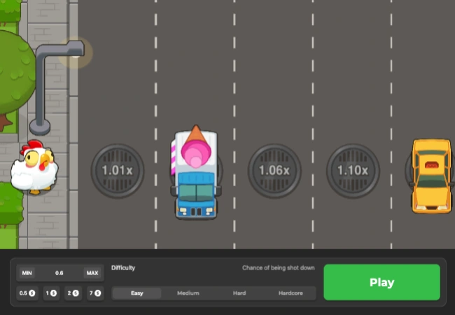 | Mechanics | The chicken crosses the road step by step, with the multiplier increasing with each successful step. Cash out at any time! |